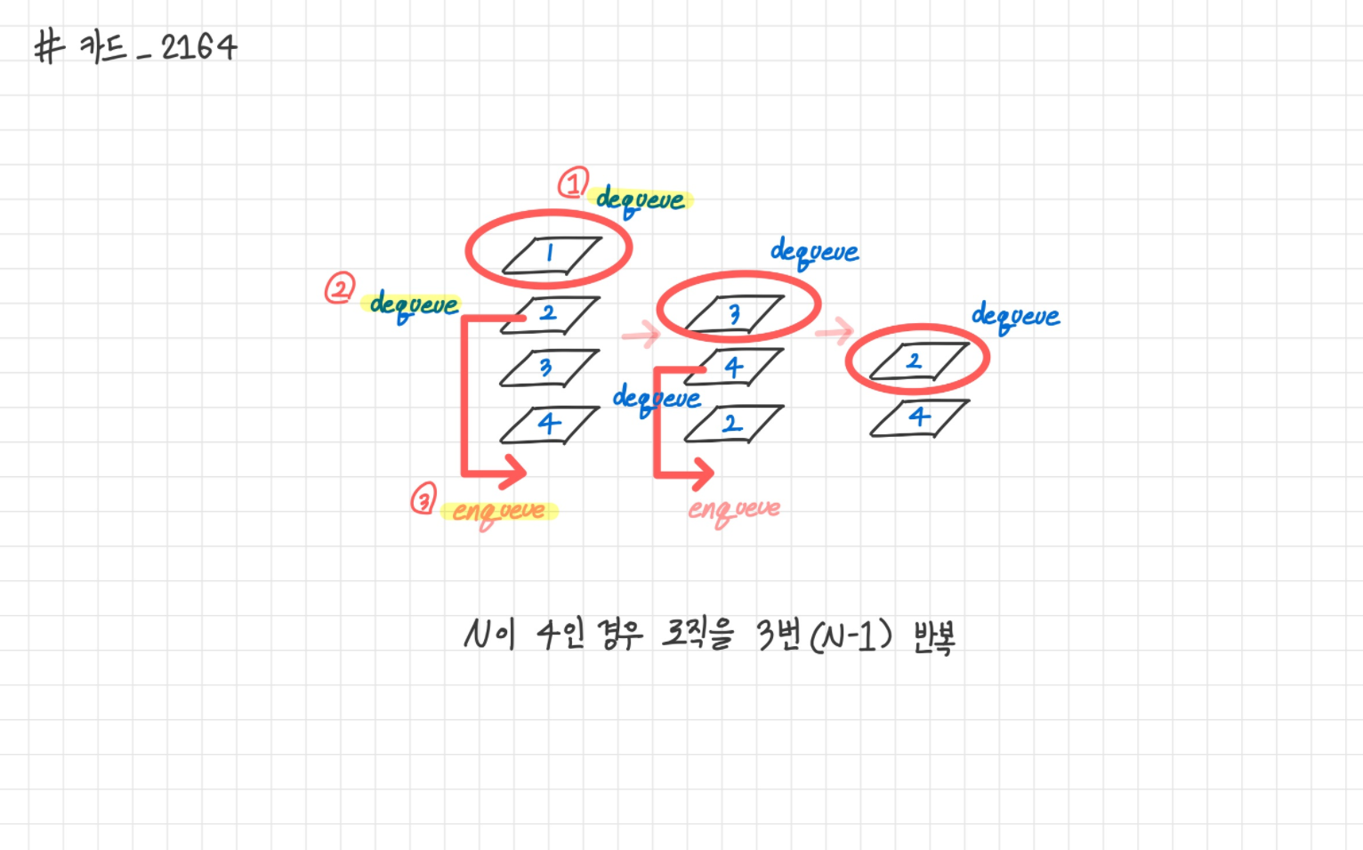 이제 다음과 같은 동작을 카드가 한 장 남을 때까지 반복하게 된다. 우선, 제일 위에 있는 카드를 바닥에 버린다. 그 다음, 제일 위에 있는 카드를 제일 아래에 있는 카드 밑으로 옮긴다.