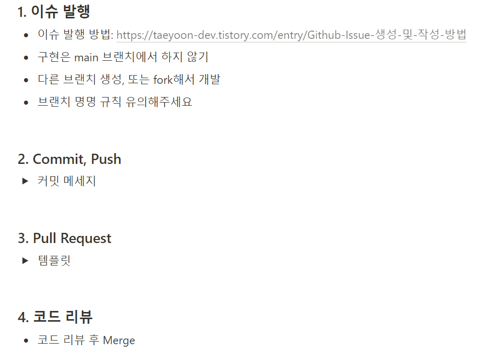 아래 내용은 내가 팀 노션에 만들어놓은 협업 가이드이다. 심플하지만 그래도 적어두면 불필요한 헤맴을 방지할 수 있을거 같아 팀을 위해 정리해두었다. 아래 플로우 중 처음 사용해보는 이슈 발행 기능에 대한 커스텀 레이블, 템플릿 지정 등을 해보고자 한다.