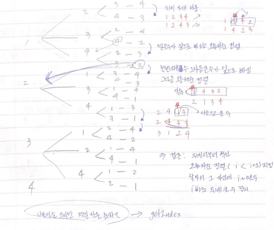 사전 순으로 가장 앞서는 순열은 오름차순으로 이루어진 순열이고, 가장 마지막에 오는 순열은 내림차순으로 이루어진 순열이다.