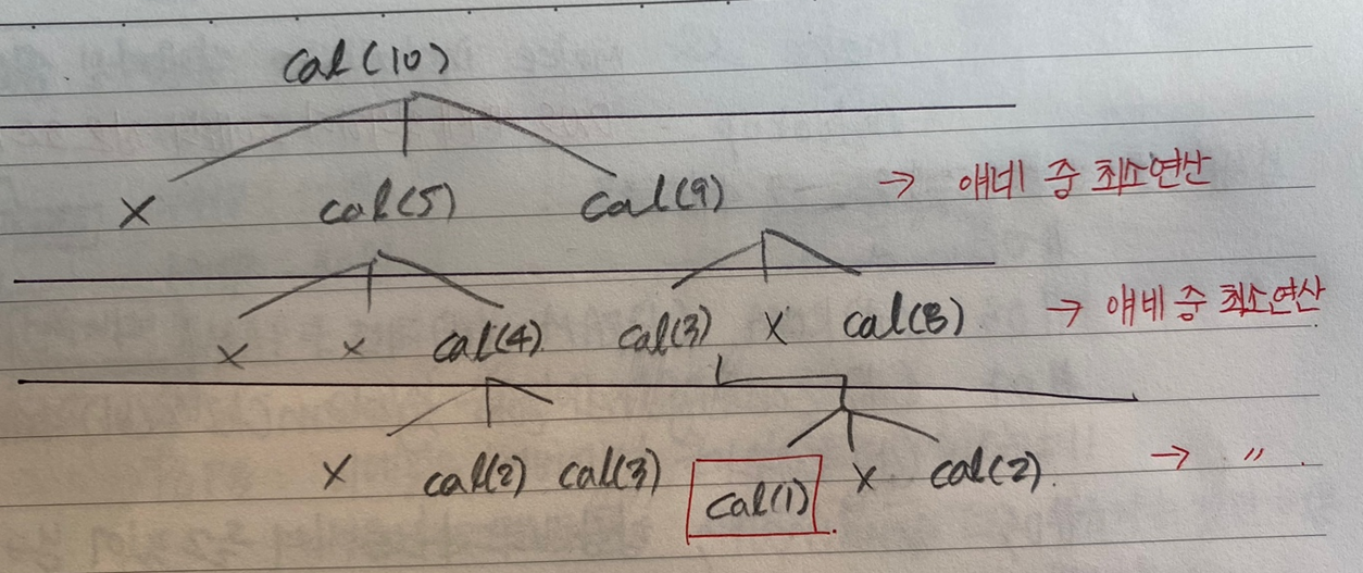지난 수업 때 들었던 동적 계획법을 사용하는 문제일거 같다는 생각이 들어서 찾아보았다. 문제를 작은 단위로 쪼개서 생각하기 위해 아래 피보나치 수열처럼 해당문제를 그려보았다.