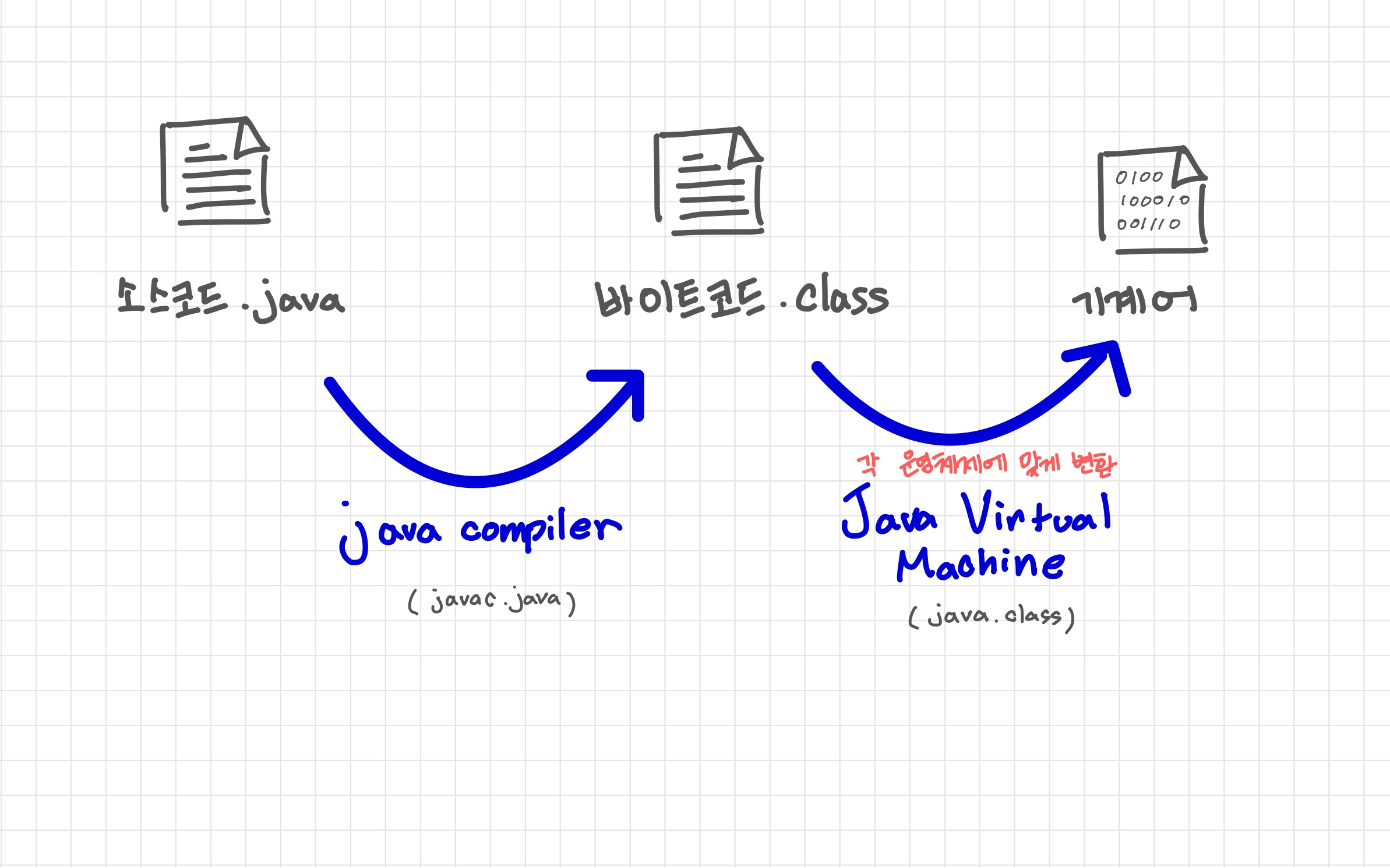 우리가 작성하는 자바 코드는 java파일로 저장이된다. 이 파일은 Java Compiler(번역기)를 통해 바이트코드로 이뤄진 class파일로 변환되고, 이 파일은 Java Virtual Machine(자바가상머신)을 통해 실행될 운영체제에 적합한 기계어로 변환되어 실행된다.
