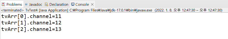 System.out.printf("tvArr[%d].channel=%d\n", i, tvArr[i].channel);